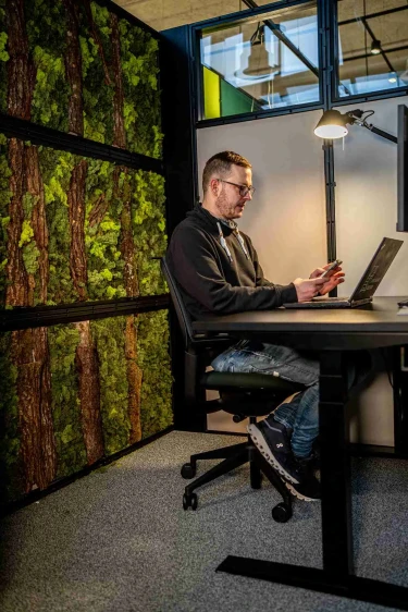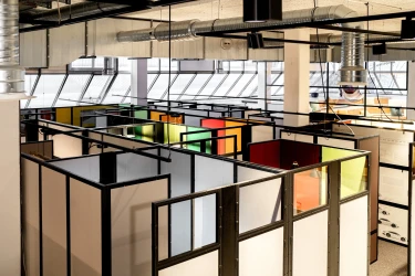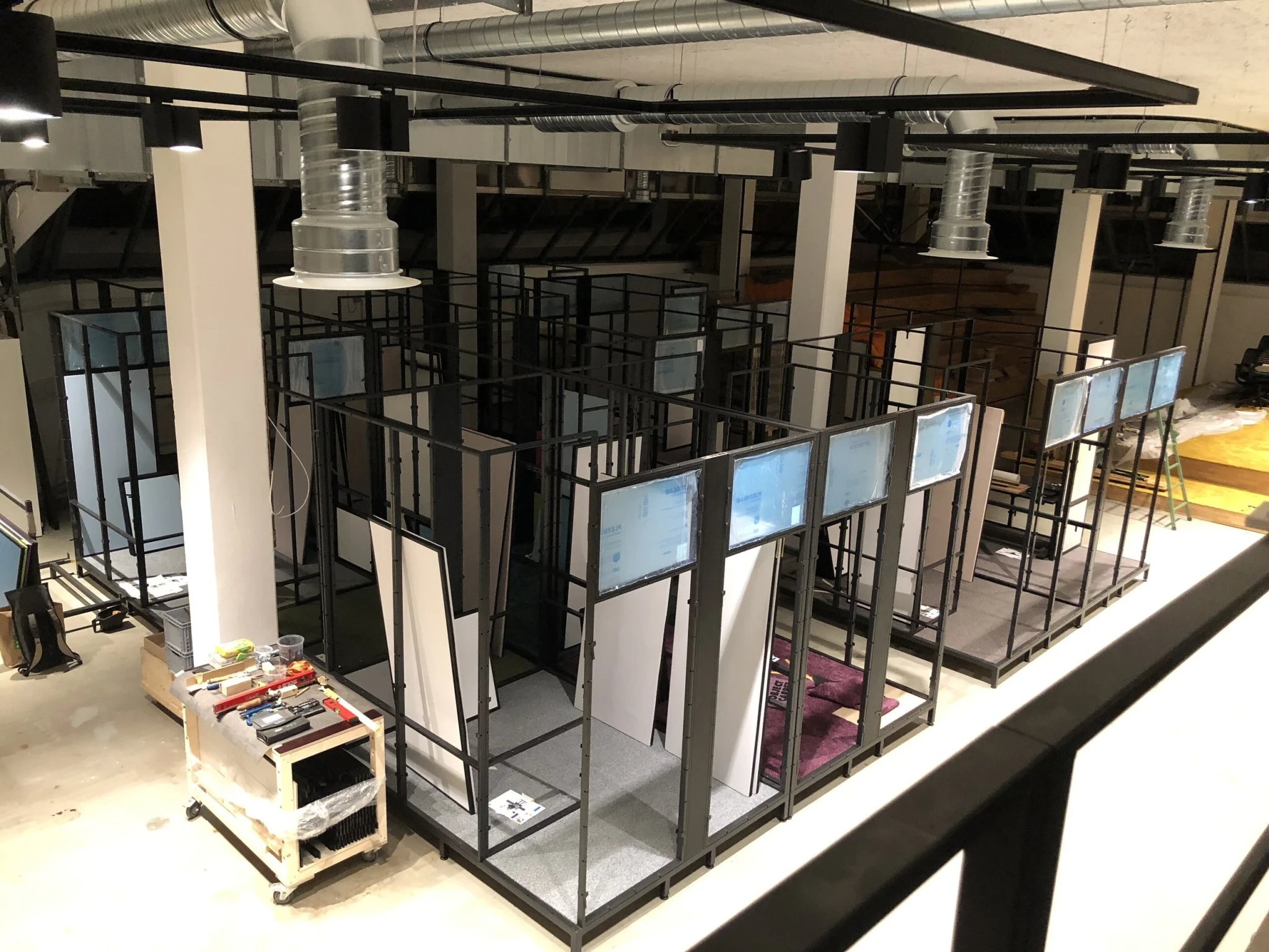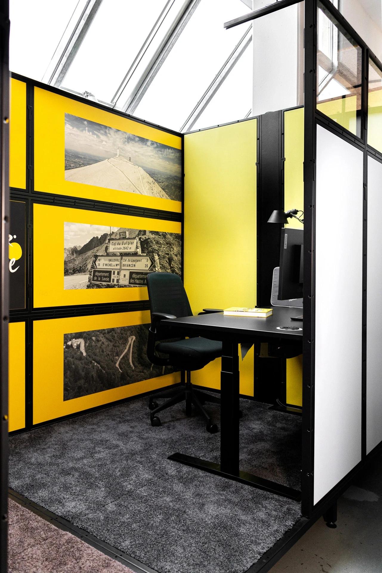 Über ein modulares Stahlrahmensystem lassen sich verschiedenste Cube-Größen und -Formen kombinieren. Mit dem klassischen Vorreiber-Verfahren können die Rahmenfüllungen völlig werkzeugfrei getauscht oder neu angeordnet werden. Der halboffene Charakter der Cubes schafft eine akustisch gedämpfte Atmosphäre – ähnlich einer großen Bibliothek.