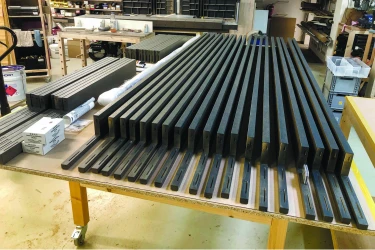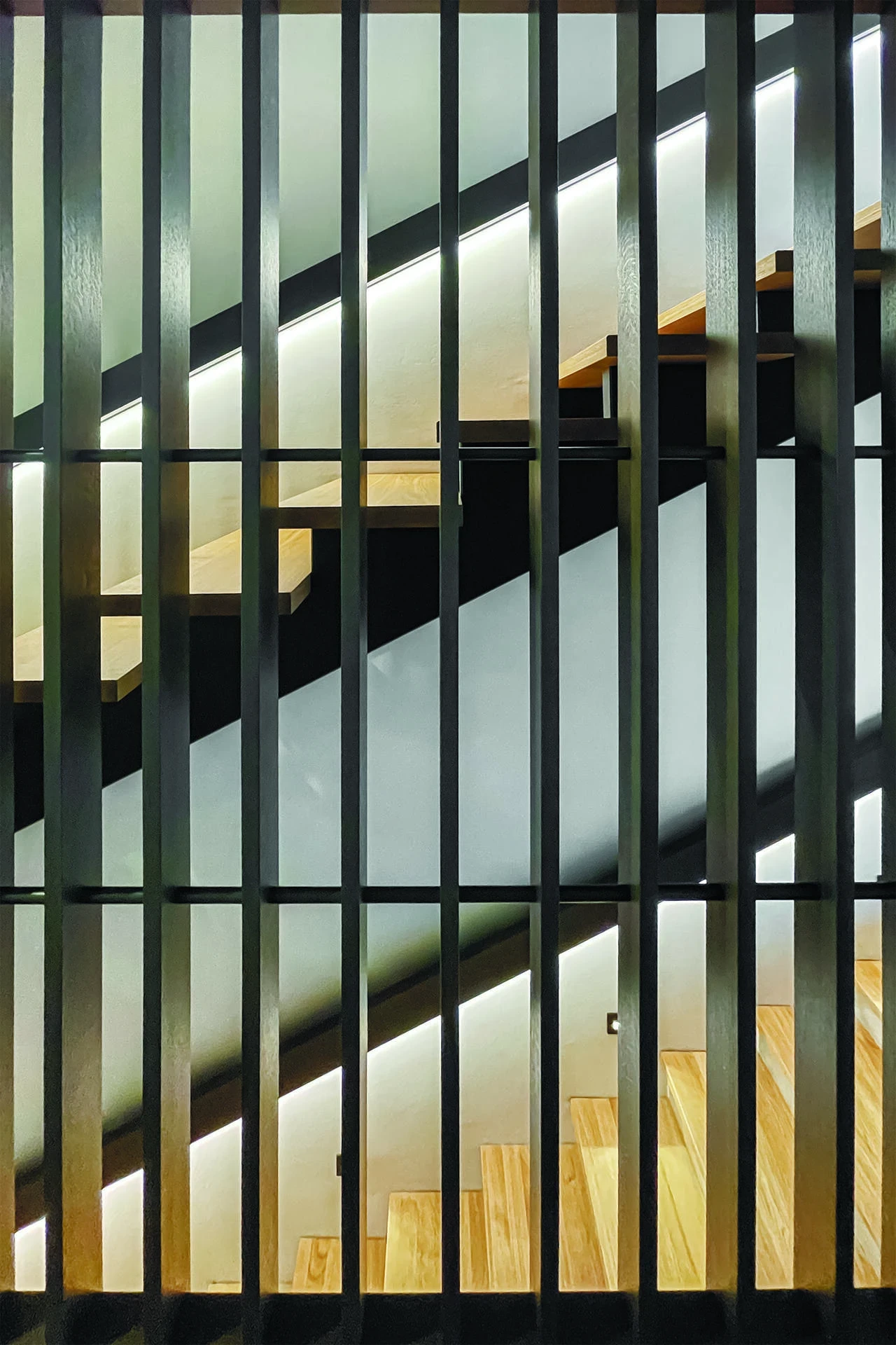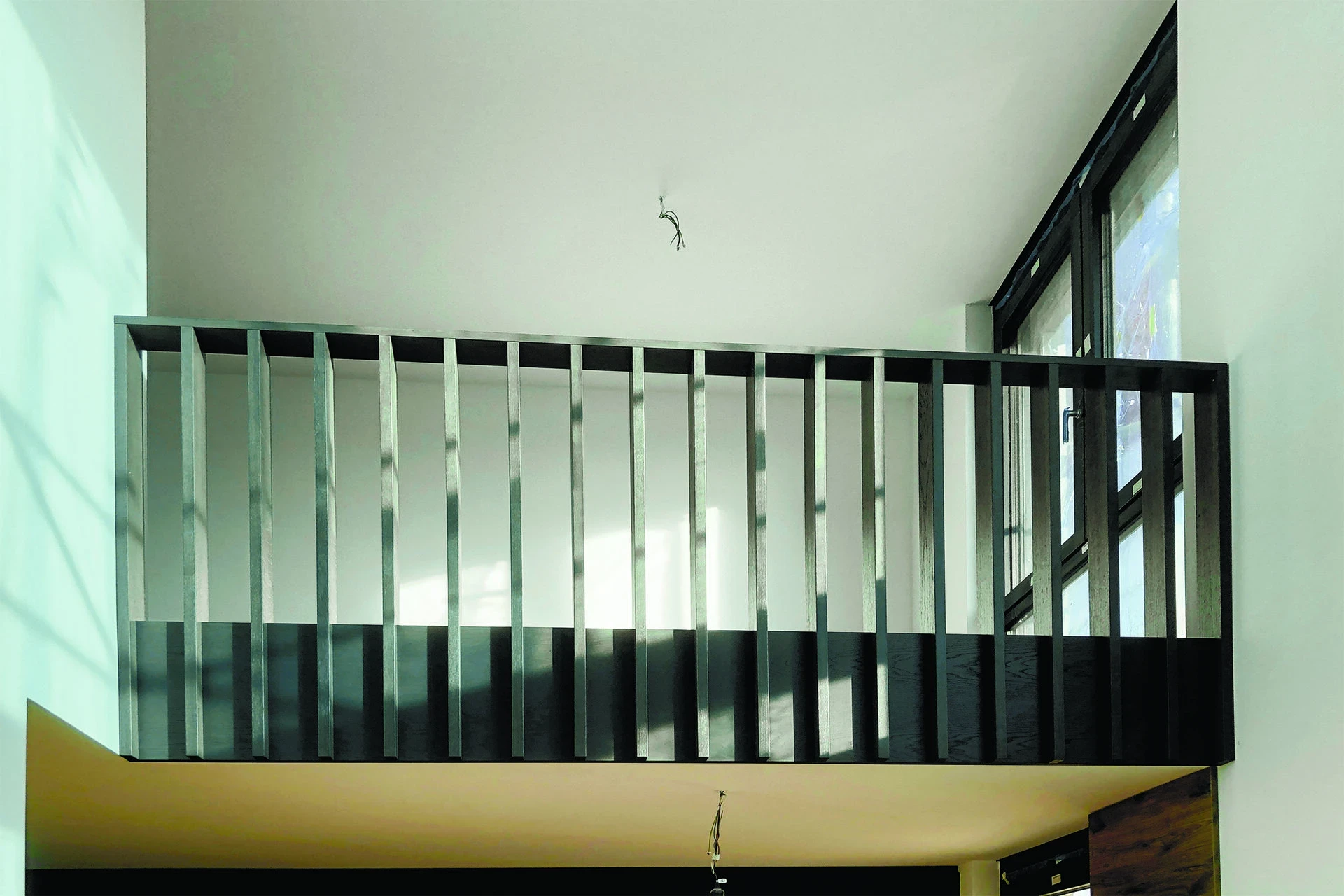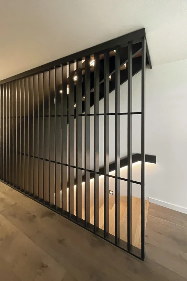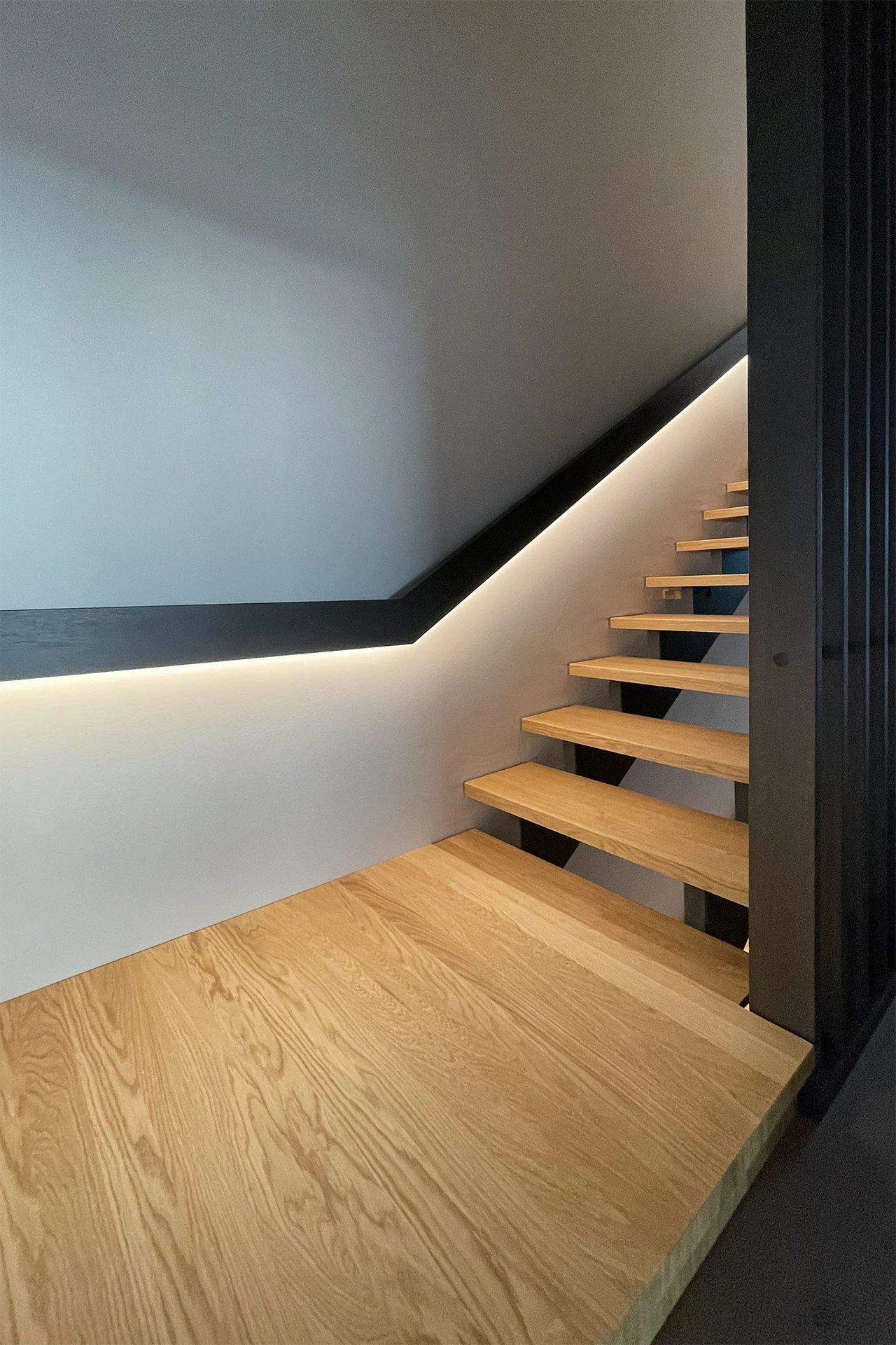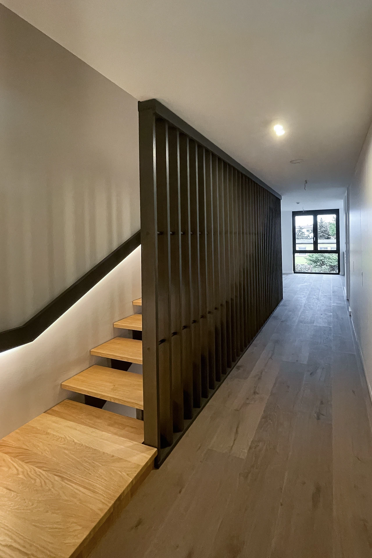 Besonderes Merkmal ist die Absturzsicherung in Lamellenform, deren vertikale Geometrie die Linienführung des Gebäudes aufnimmt. Pulverbeschichtete Abstandshalter, verdeckte Verankerungen und der vollständige Verzicht auf sichtbare Schrauben erzeugen ein homogenes Bild. Die indirekte LED-Beleuchtung setzt den Handlauf subtil in Szene und sorgt gleichzeitig für sichere Wege im Alltag.