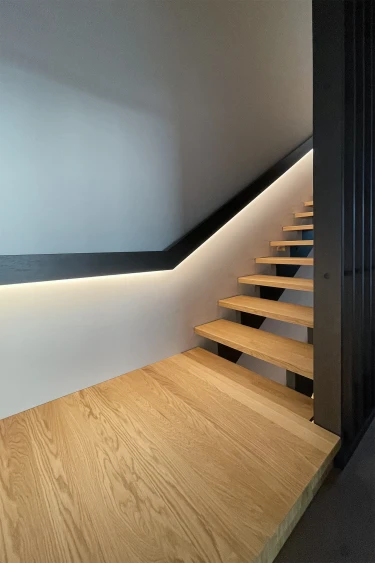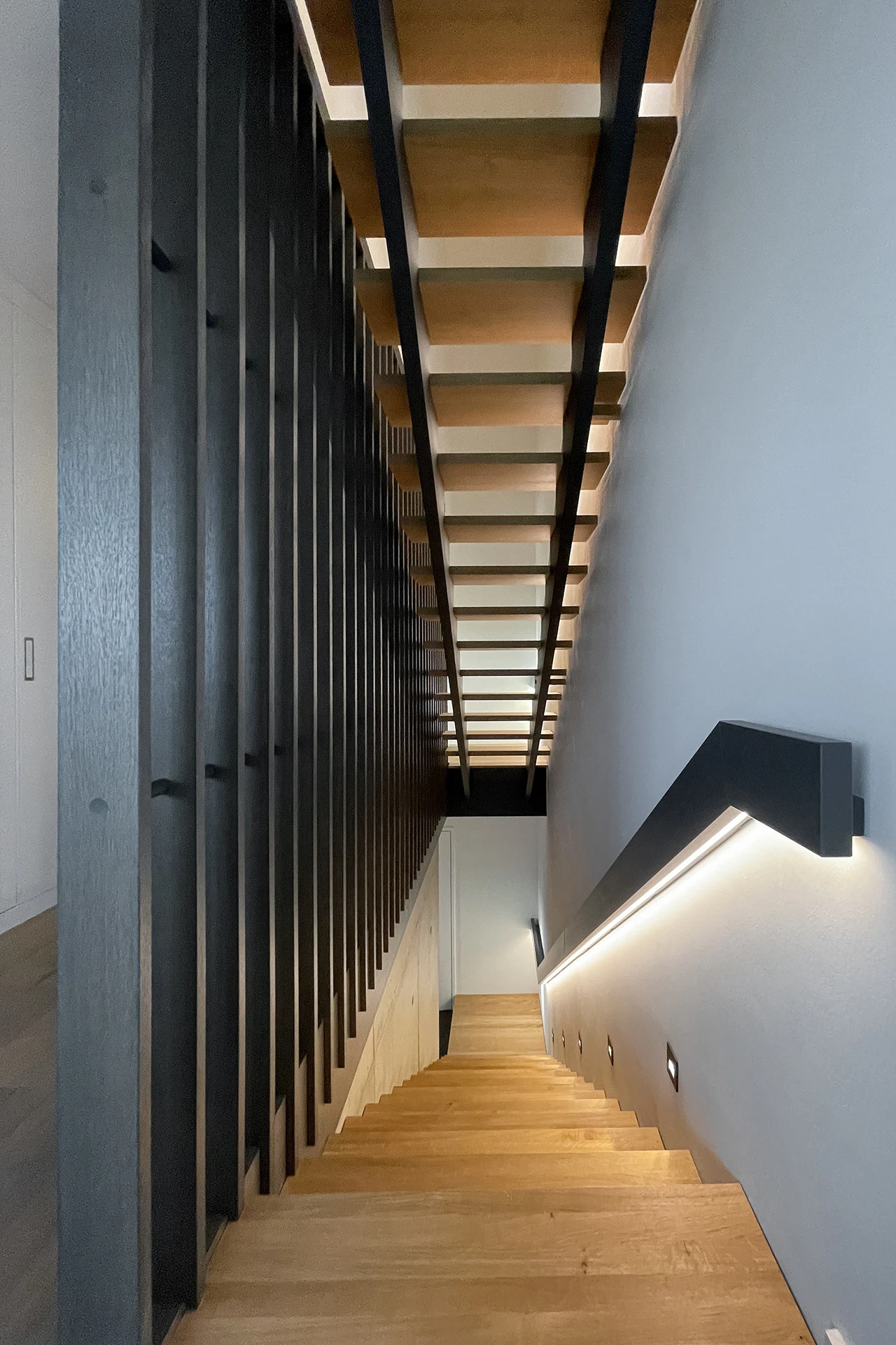 Die Treppe im privaten Wohnhaus interpretiert klassische Handwerkskunst in einer architektonisch klaren Formensprache. Die aufgesattelte Konstruktion erzeugt eine frei tragende Optik und verbindet Erdgeschoss, erste und zweite Etage mit spürbarer Leichtigkeit. Schwarz gebeizte Eiche mit Haarwachsöl-Finish lässt die natürliche Maserung sichtbar und verleiht der Anlage eine ruhige, zurückgenommene Präsenz, die sich präzise in das Gestaltungskonzept des Hauses einfügt. Der Anspruch von Bauherr und Architektenteam: maximale Klarheit, Eleganz und Qualität – konsequent umgesetzt bis ins Detail.