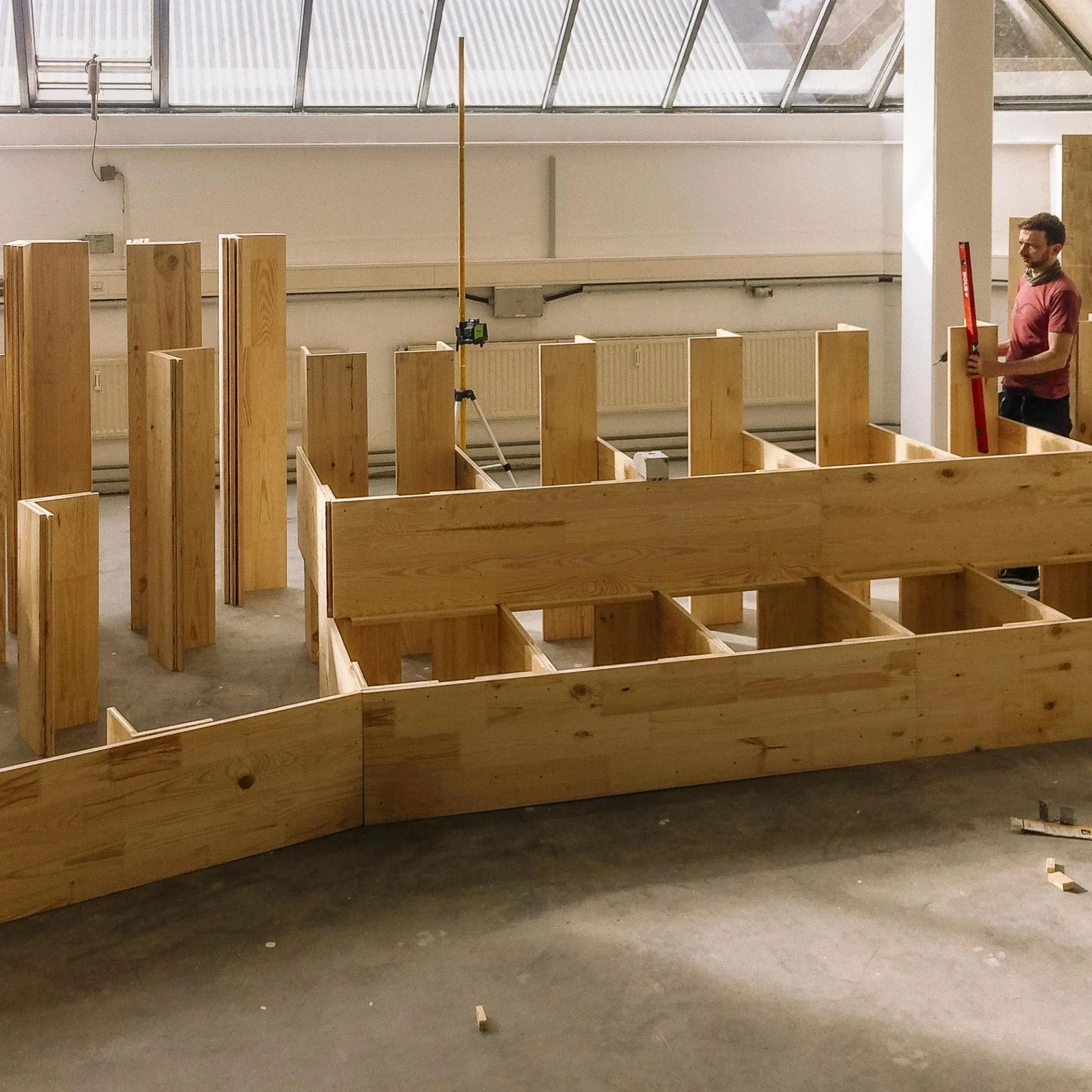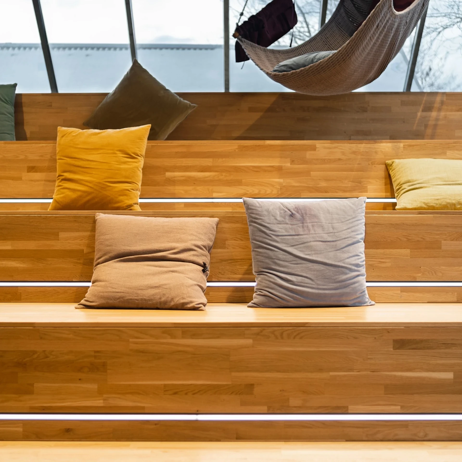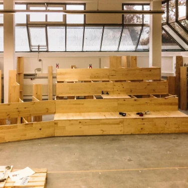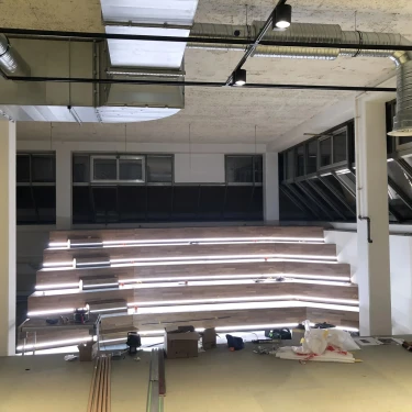 Die Sitztreppe in der Neuen Weberei dient als zentrales Kommunikationselement und Treffpunkt im Arbeitsalltag. Sie schafft Raum für Austausch, Workshops und spontane Meetings, unterstützt hybride Zusammenarbeit durch integrierte Technik und bietet zugleich eine Atmosphäre für gemeinschaftliche Aktivitäten.