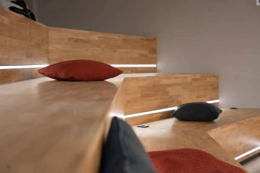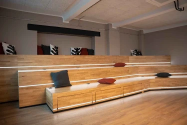 Drei Stufen, dezent beleuchtet über dimmbare LED-Streifen und eingefasst in eine pulverbeschichtete Sockelkante aus Stahlblech – so entsteht eine Konferenztreppe, die Funktionalität, Design und Gemeinschaft harmonisch vereint.